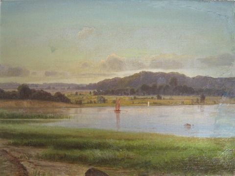Schmidt, Alexander (1842 - 1903) Danmark: Sejlbåde på en sø, sommer. Signeret.: A. Schmidt 95. 18 x 24 cm. Uden ramme. Doubleret.Emne nummer: 4315