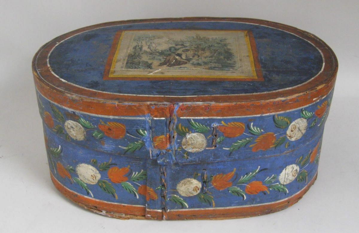 Wig box, Germany, 19th century. Blue, red and white painted with rose pattern. On the cover hand-colored lithography. L.: 47 cm. With repairs. Item number: 4450