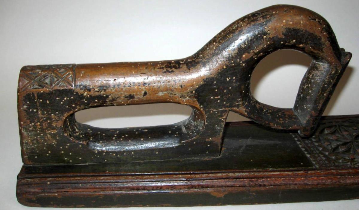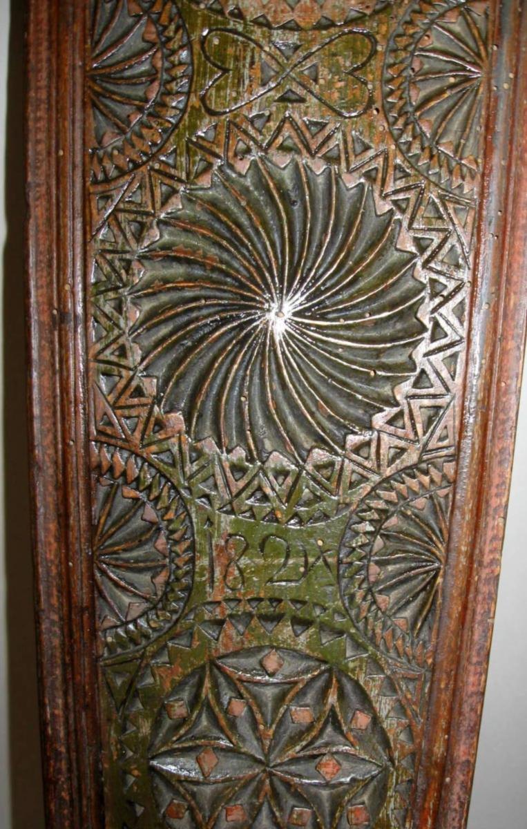 Danish washingboard, 19th century. With horse grip and carvings. Dated 1824. Green and red painted. L .: 61 cm. With repair. Provenance: East Jutland.Item number: 6553