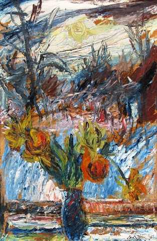 Borregaard, Eduard (1902 - 1978) Danmark: Blomster i en vase i et vindue. Olie på lærred. Signeret.: Borregaard 1935. 87 x 58 cm. I en gråmalet samtidig ramme.Emne nummer: 7382