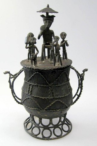 Bronze jar with lid, 20th century, Benin, Nigeria, Africa, Cast perdue, unique. The lid decorated with a king and his people that play. The jar on a pierced foot jar with handles in the form of people who climb ladders. H .: 29 cm.Item number: 7503