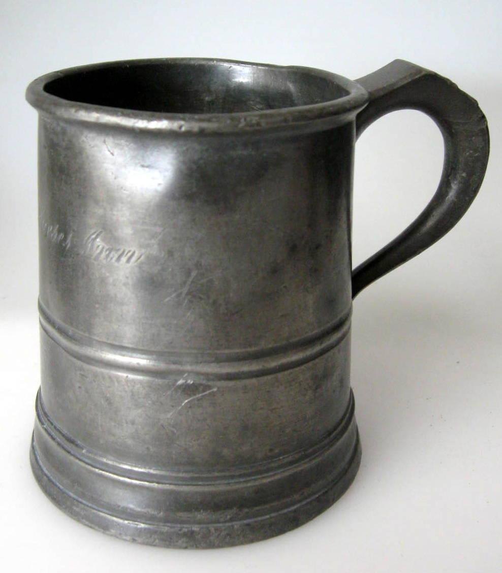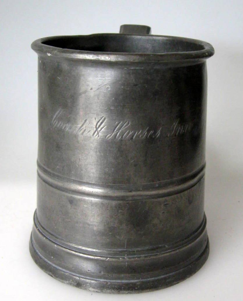 Antique tankard in pewter, England, 19th century. With the engraving: "Coach & Horses Inn". Stamped outside with control stamps. Inside the master stamp. H .: 9 cm.Item number: 8652
