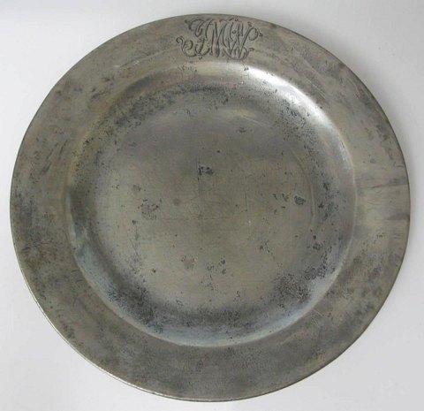 Tin tallerken, 1744, mester Edward Toms, London. Stemplet med mestermærke og Super Fine Hard metal. Dia.: 24 cm. På fane monogram. Edward Toms etablerede sig i Tower Street 77, London, i 1744. Litteratur: O. P. Cotterell side 322, no. 4770Emne nummer: 8661