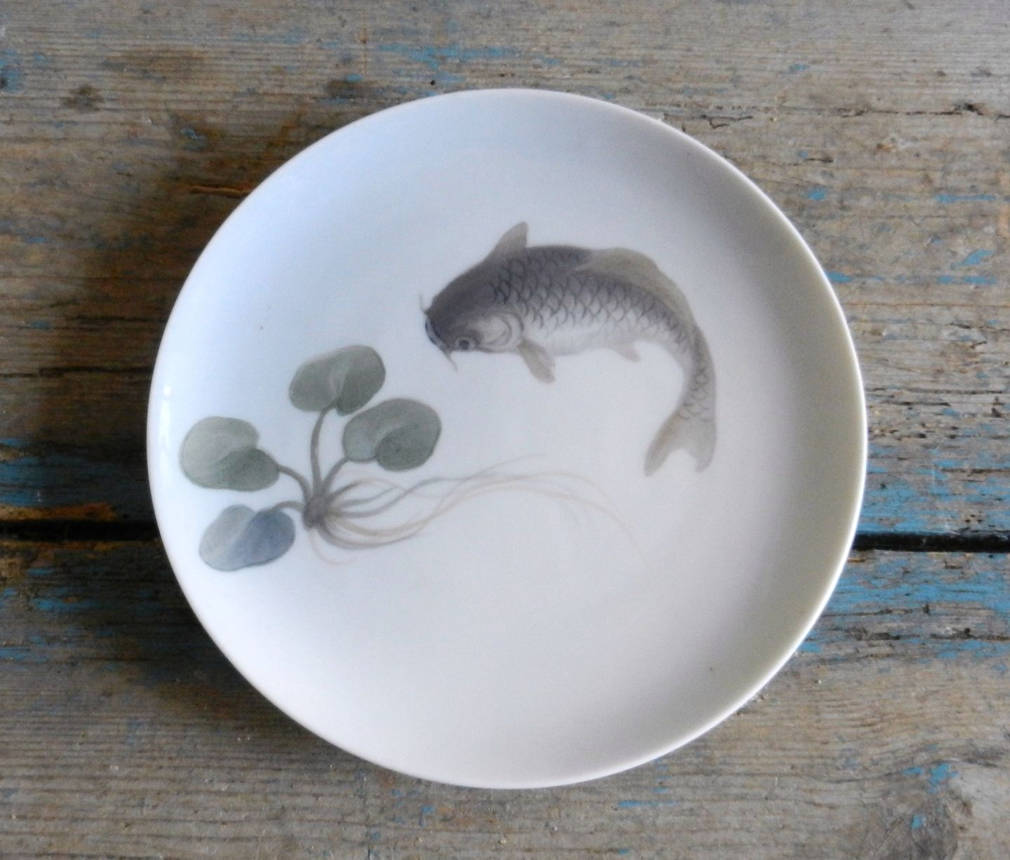 Royal Copenhagen Art Nouveau væg tallerken, dekoreret med karpe og vandplante.