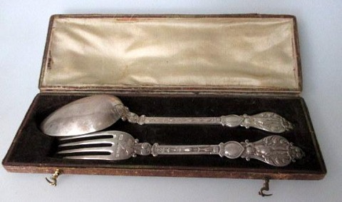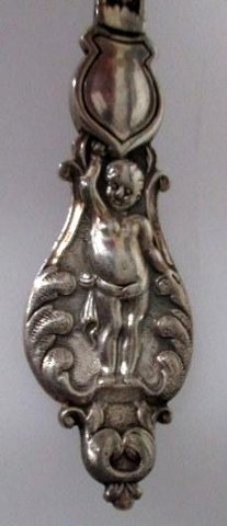 Service af sølv i original æske, England, 19. årh. Historicisme, dekoreret bl.a. med mønstre og putto. L.: 16 - 18 cm. Samlet vægt.: 78 gram. Stemplet. I æske med navnet.: Axel Falck.Emne nummer: 9210