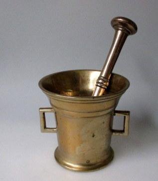 Antik messingmorter med pistil, Danmark, 18. årh. Utydeligt stemplet i bunden. H.: 11 cm. Længde pistil: 19,5 cm.Emne nummer: 9515