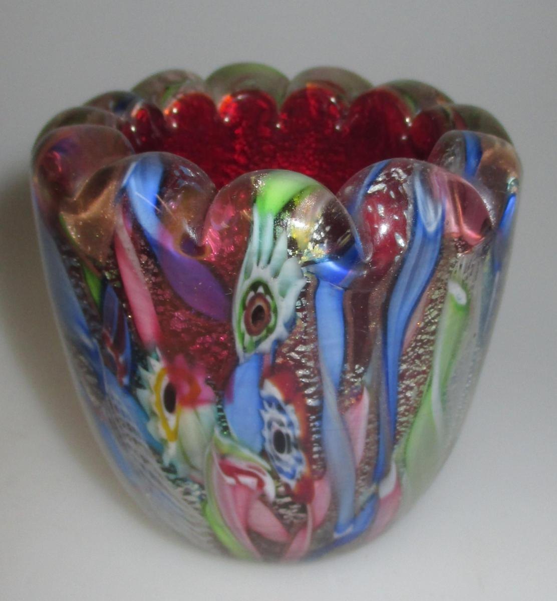 Vase, Toso, Aureliano, Venice, ca. 1955. Dino Martens. Red glass with inlaid silver foil, more clear overlay glass. Intermediate section with glass rods and milli fiori. With an arched edge. H .: 6.5 cm. Milled base.Item number: 9712