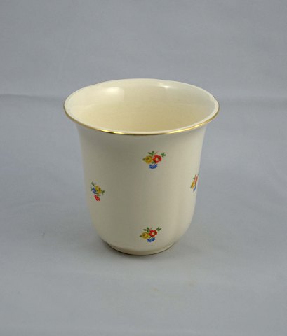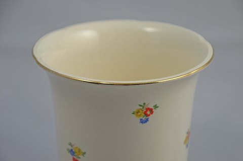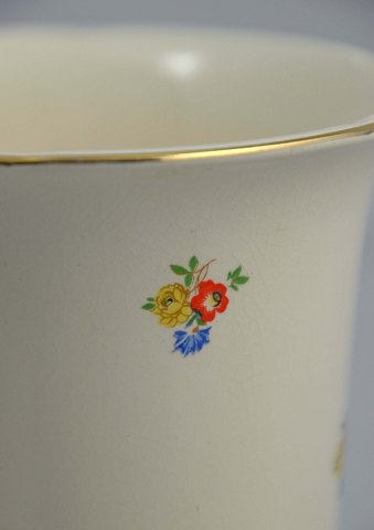 Vasen har blomstermotiver og en intakt gylden kant.
