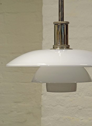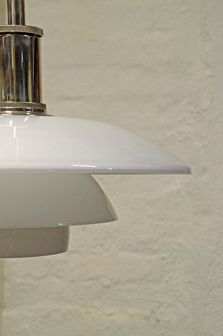 PH glaspendel model 4½-4 designet af Poul Henningsen med skærm af mundblæst hvid opalglas og fatningshus af højglans forkromet aluminium. Der kan anvendes lyspære på max 150 watt.Lampen er i perfekt stand. Arkivfoto