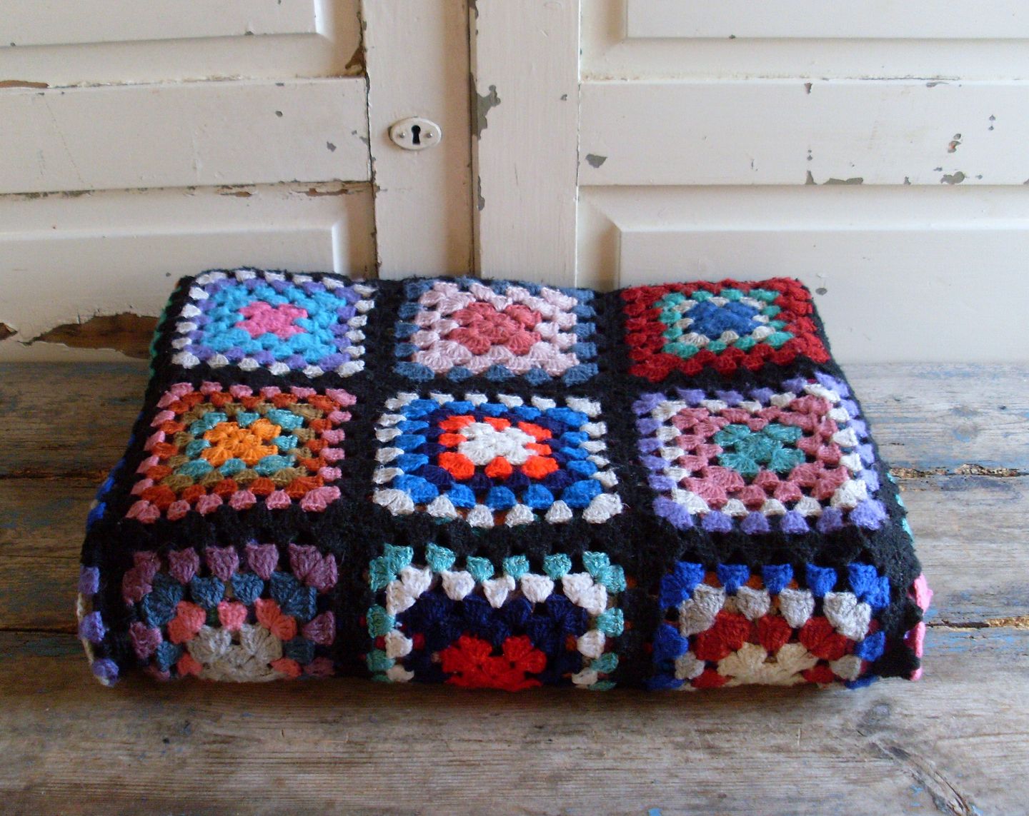 Skønt stort hæklet tæppe i papegøjefarver.Mål 165x200cm.