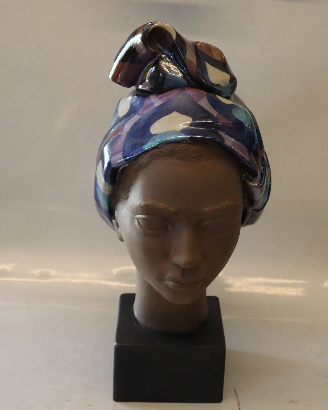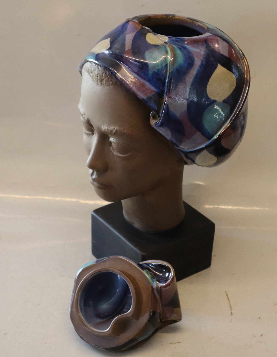 Royal Copenhagen Stoneware 3139-250 Aluminia Woman's head w. lid 17" Margrethe. In nice and mint condition with traces of use and age