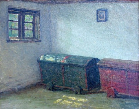 Maagaard, Valdemar (1864 - 1937) Denmark: Peasant Interior with two chests. Oil on canvas. Inscribed on the back: Painted of my Father, Ove Maagaard. On the stretcher further stamp: V. Maagaard estate auction. 27 x 34 cm.In gilt frame with ornamentation.
