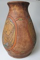 Dansk kunstner o. 1900, Vase. Jugend. Rødler. Kold bemalede dekorationer. 1) 2 fiskehejre, der fisker. 2) En ræv der ankommer til fiskehejre reden og 3) Ræven der angriber fiskehejren i reden, så æggene triller ud. Under bunden signeret.: no. L. 4. og med blyant: RgN.Unika stykke. Med et par mindre afslag i leret ved bunden.