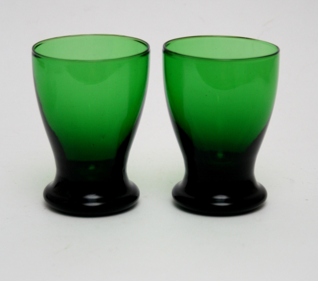 Holmegaard glasværk 1900. Mørkegrønne jyske punchbæger, højde 9,2 cm. Diameter 6,5 cm. Pris: 275 kr. stk. Lager: 4