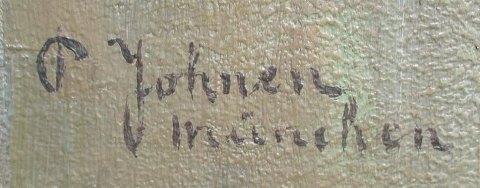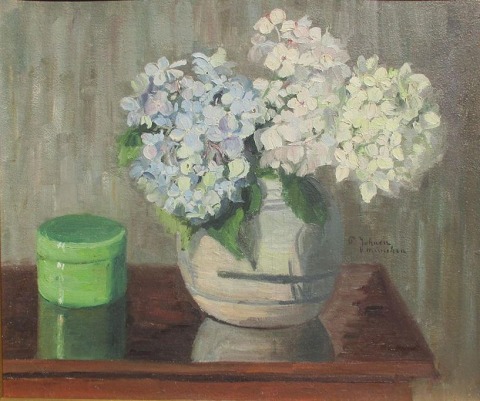 Johnen, Pauline (1880 -?) Germany. Still Life with Hortensia in a bojan on a table. Oil on wooden board. 50 x 60 cm. Signed .: P. Johnen, Munich.With newer gilt frame.
