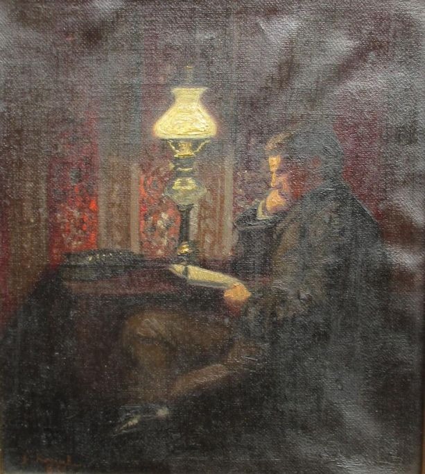 Kraul, Fritz (1862 - 1935) Denmark: Interior with a reading man. Oil on canvas. 21 x 19 cm.With gilt frame from Frantz Høy in Horsens.
