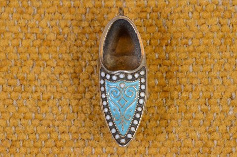 Pendant of Marokken shoe in mini size of silver, gildet silver dekorated with enameled in turquoise, white and black. Stamped 925 S. Str .: 2.5 cm * 1 cm. Art No. 88 Dealer
