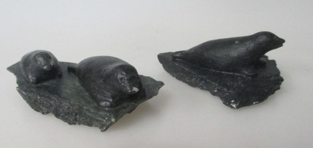 Par Grønlandske fedtstens figurer af sæler, 20. årh. Længde 7 - 9 cm. Signeret.: Ortorok 1992. Emne nummer: 14329