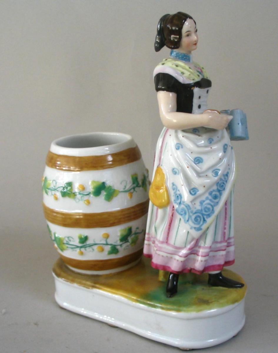 Tysk porcelænsfigur, o. 1880, i form af servitrice i kjole med brød og ølkrus. Polykrom bemaling med sorte sko. Bagved tønde. H.: 19,5 cm. L.: 14,5 cm. I bund produktionsnummer.: 26. Perfekt stand!Emne nummer: 1327