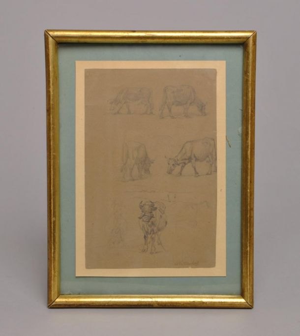 Kittendorff, Johan Adolph (1805 - 1902) Danmark: Køer. Bly på papir. Signeret. A. Kittendorff. 16 x 10,5 cm.Indrammet.