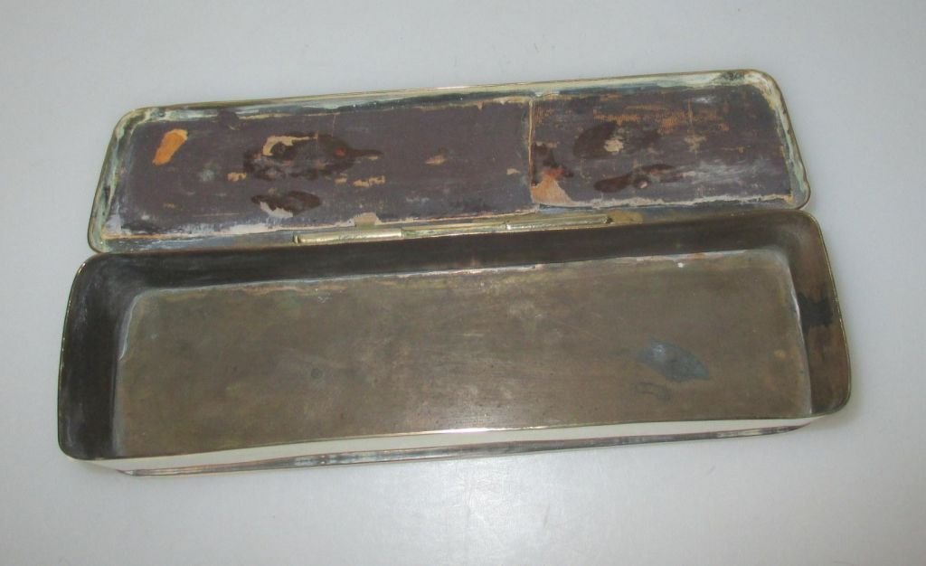 Hollandsk snus tobakæske i messing, 19. årh. Aflang med rundede ender. Dekoration på låget i form af blomster. L. 15 cm. B.: 4,5 cm. H.: 2,9 cm. Flot eksemplar!Emne nummer: 15858