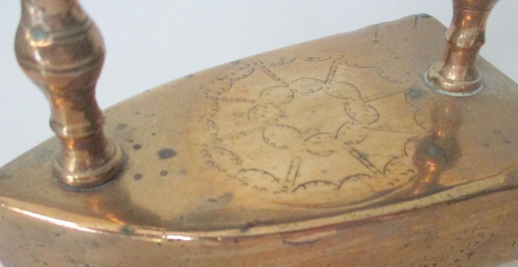 Stryge jern i messing, 19. årh. Danmark. Med dekoration i formn af blomst. Utydeligt mester stempel. Længde.: 13,5 cm.Emne nummer: 15991