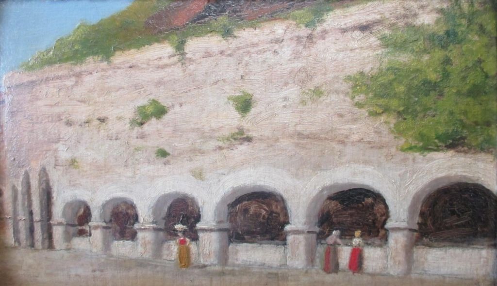 Rosenstand, Vilhem (1838 - 1915) Danmark: Vaske pladsen i St. Geminiano, Italien. Olie på pap. Monogrammeret. 16,5 x 27 cm.