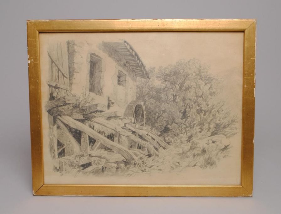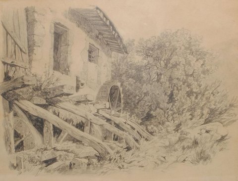 Møller, Jens Peter (1783 - 1854) Danmark: Vandmølle. Bly på papir. Usigneret. 25,5 x 33 cm.Indrammet.