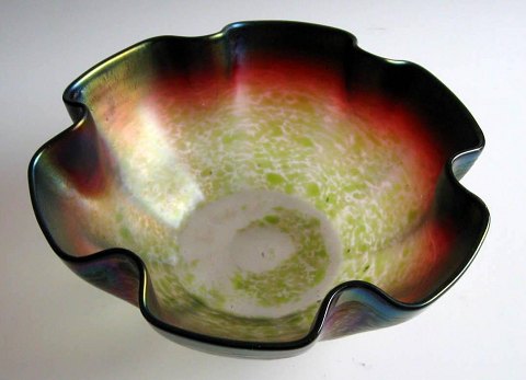 Art Nouveau bordskål i irriseret glas, ca.1900. Med bølget kant. Mat glas med overfang i lysegrønt, violet og irriserende glasmasse. Antagelig Østrig.Fantastisk stand.