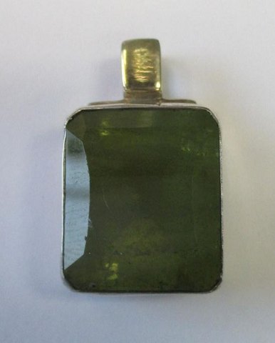 Pendant in silver / gold, Birthe Komselis, Athena (after 1997), Aalborg, Denmark. With green stone. Height: 2.5 cm. B: 1.5 cm. Stamped.Item number: 17124