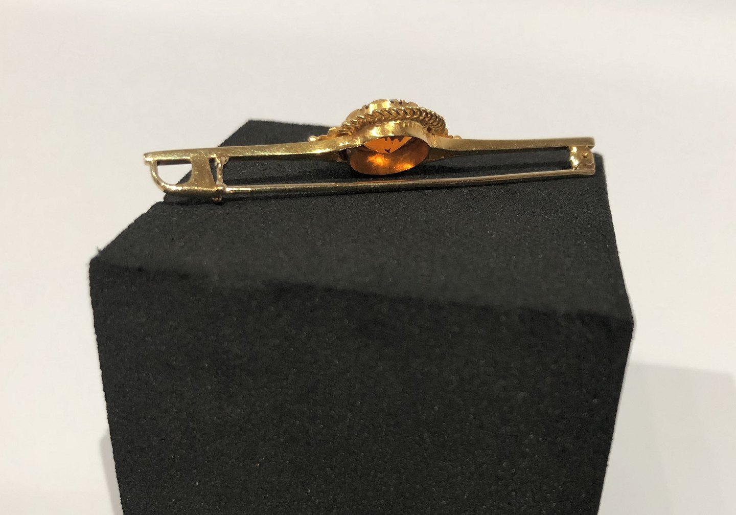 Brooch in 14 ct. gold with amber colored stone.5,5x1,3 cm.