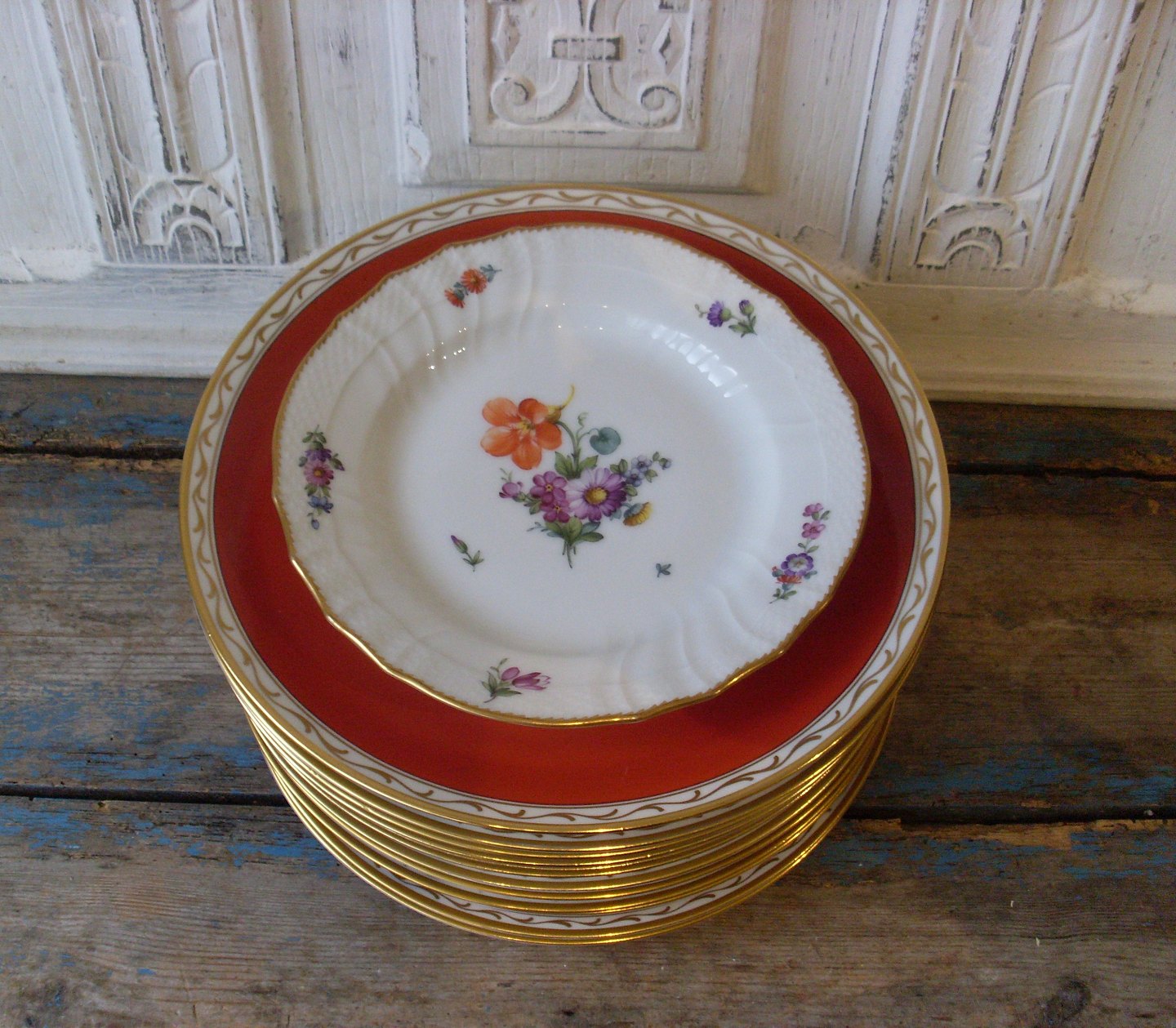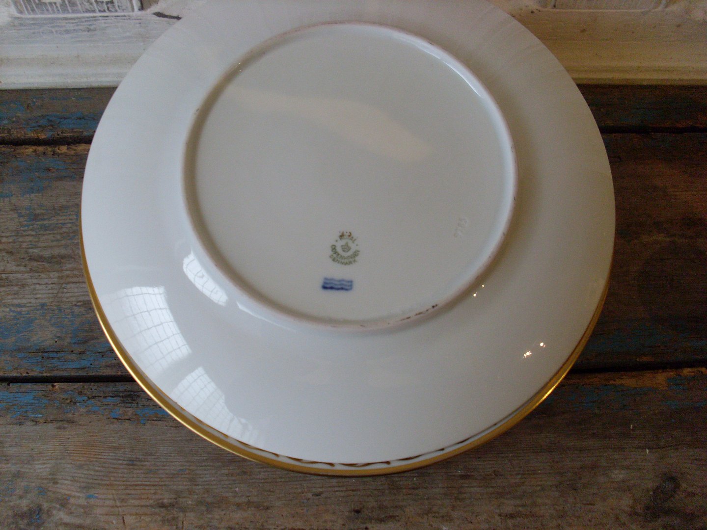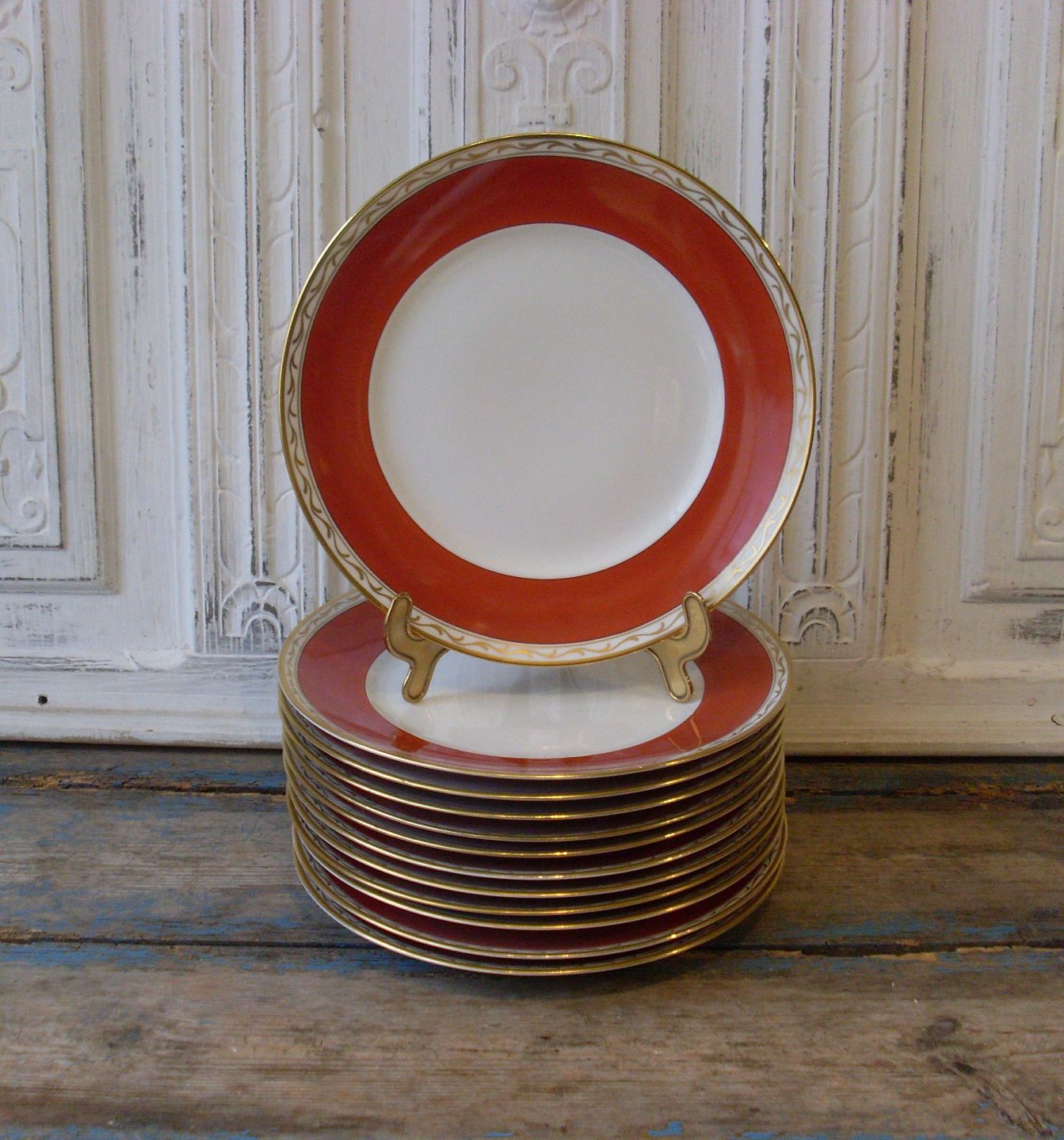 Royal Copenhagen dækketallerkener dekoreret med guld og teglfarvet fane.No. 9785, 1.sort