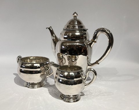 Coffee set consisting of coffee jug, sugerbowl and cream jug with delicate pearl edge and in hallmarked silver.Jug - H - 26 cm, W - 25 cm and D - 13,5 cm.