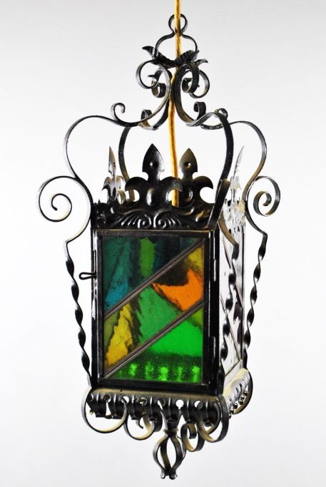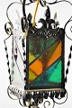 Ampel in small forging work, approx. 1900. Denmark. With stained glass. H. 47 cm.Item number: 17954