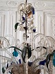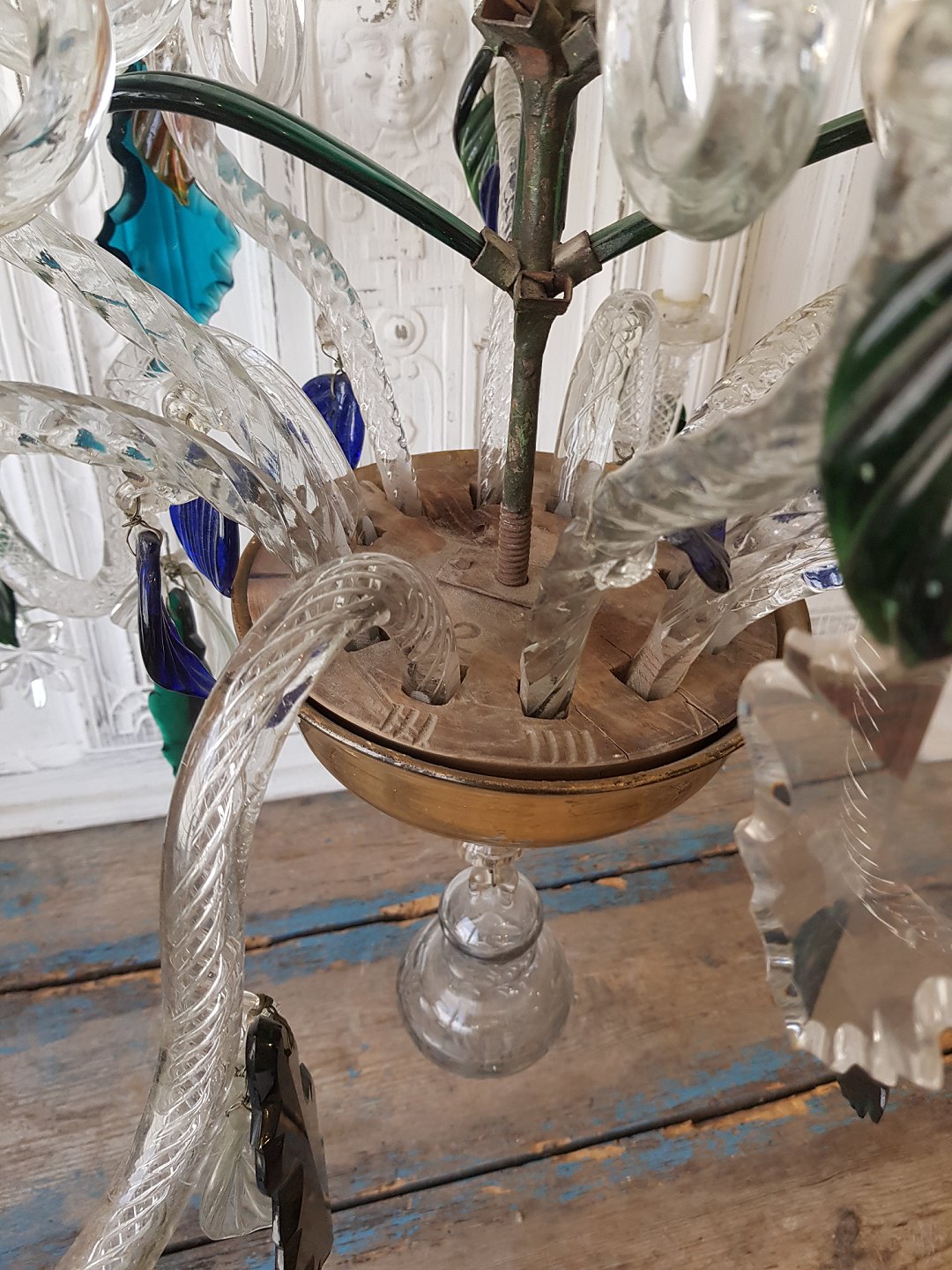 Fantastic Italian Baroque glass chandelier from the late 1700.Four light candles, eight swivel arms adorned with numerous colored prisms, leaves and glass of flowers. The chandelier are in good condition, though with damage to prisms and leaves. Two lightbulbs are damaged, but can be easily used.