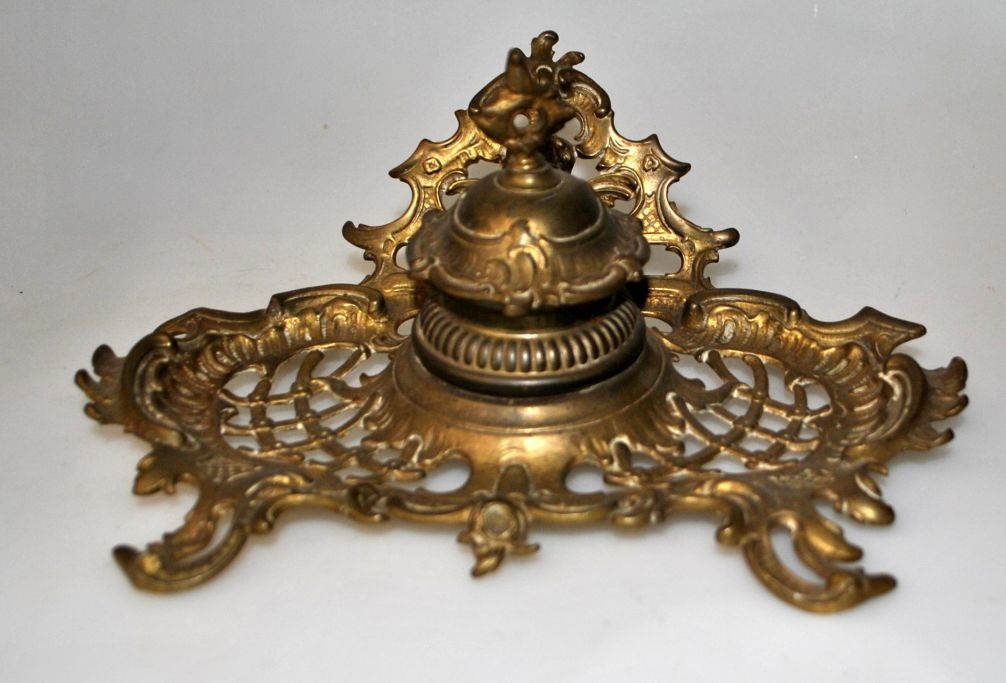 Fransk skrivesæt, bronze, 19. årh. Nyrococo. Dekoreret med bl.a. engel. Længde.: 22 cm. B.: 16 cm. H.: 8 cm.Emne nummer: 18917
