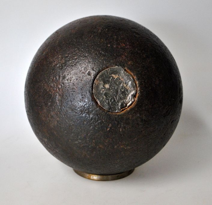 Kanon kugle, 18./19. årh. Danmark. Jern med bly. Dia: 13 cm. Har været udlånt til TV udsendelsen Krejlerkongen, TV 2.Emne nummer: 19532
