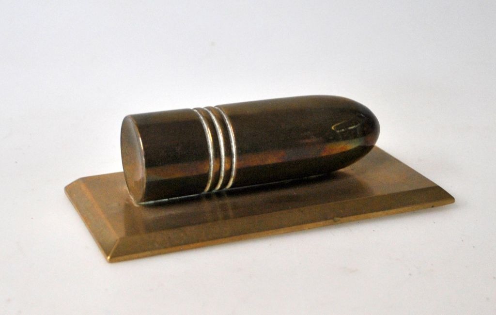 Brevægt i messing, 20. årh. Danmark. Udformet som en granat. L.: 12,5 cm.Emne nummer: 19636
