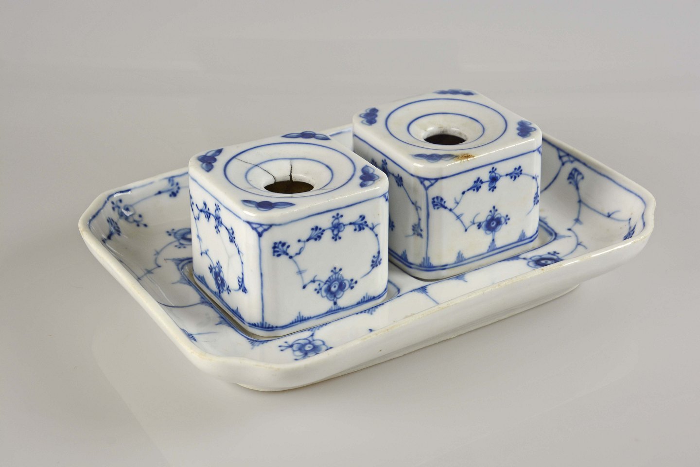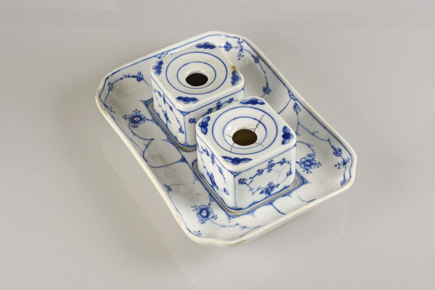 Blåmalet Blækhussæt fra perioden år 1853-1895 fra Bing og GrøndahlSættet fremstår med revner i et blækhusets topkant.