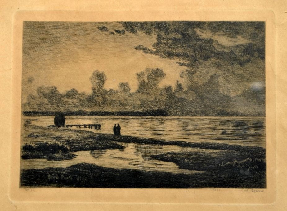 Locher, Carl (1851 - 1915) Denmark: Summer night at Hornbæk Beach. Print. Opus 36. Signed 1898. 16.5 x 22 cm.Framed.