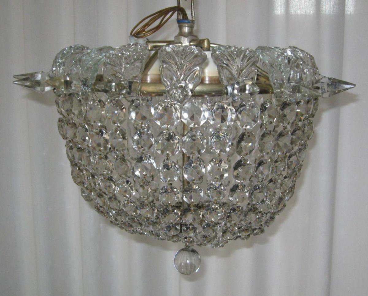Stor sækformet prismekrone, Danmark, ca.1900. Til 3 lys, med 35 kæder og palmetter. I alt 470 prismer. Dia.: 48 cm. H.: 40 cm.Flot stand.