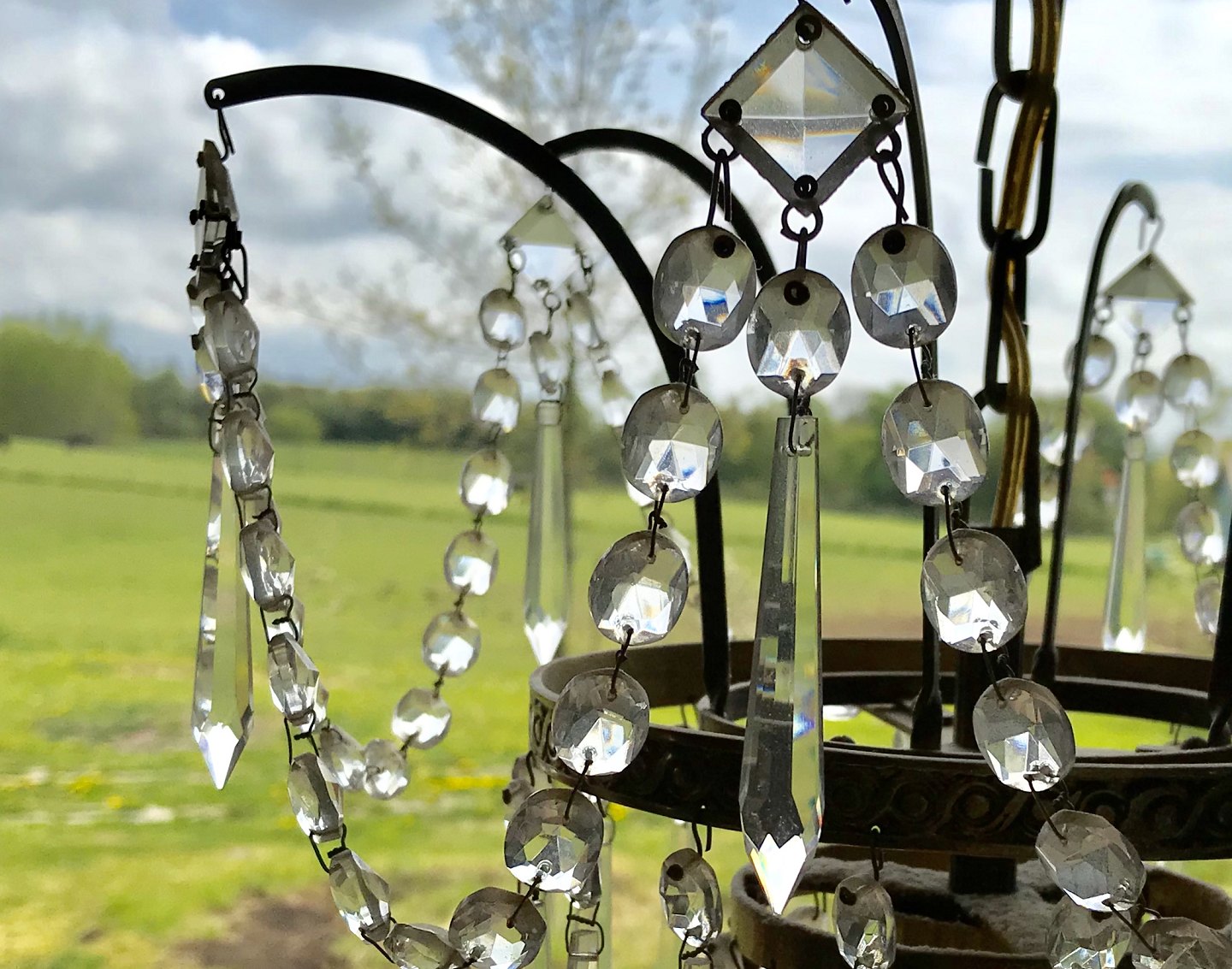 Lysekrone med slebne glasprismer og bundplade i rødt glas. Højde ca. 60 cm *Lysekronen fremstår generelt i fin brugt stand dog med et par enkelte prismer i stykker*Lager: 1