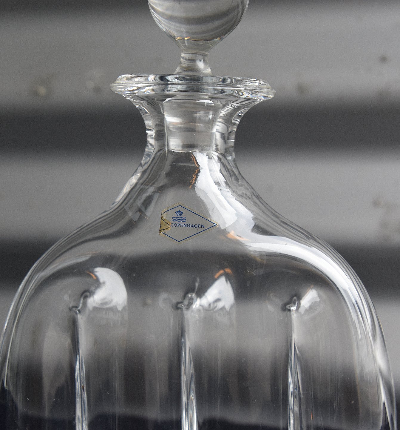 Karaffel fra barserien "Maxim". Flad korpus med 3 sammenklemninger, lodret. Hals med udsvejet rand. Massiv kuglepropDesign Michael Bang for Holmegaard Glasværk, Royal Copenhagen