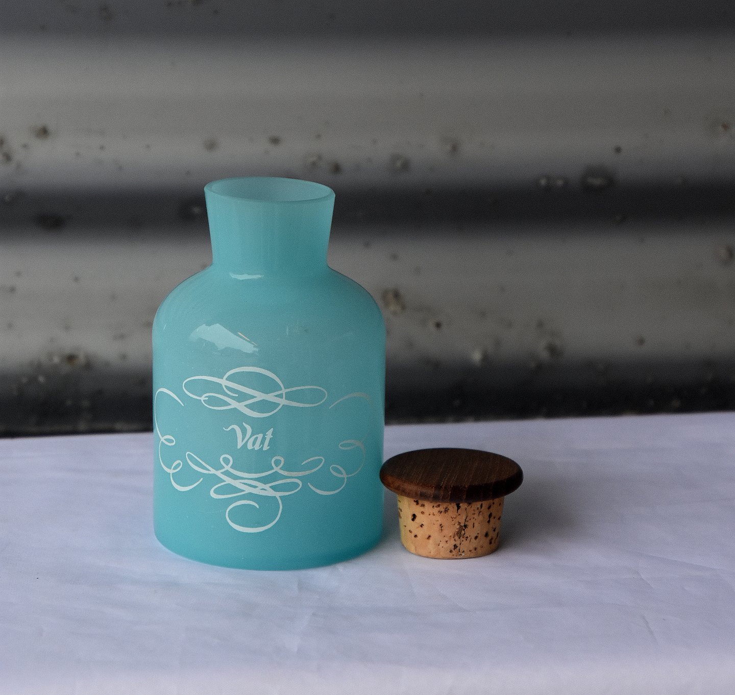 Lyseblå glaskrukke, til vat, med teaklågDesign ukendt
