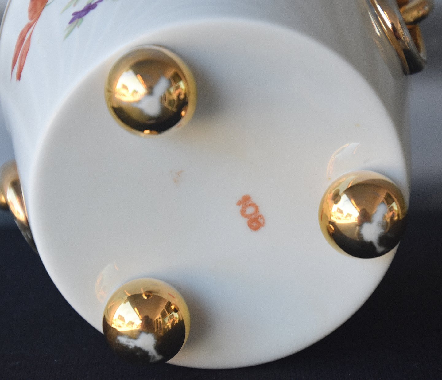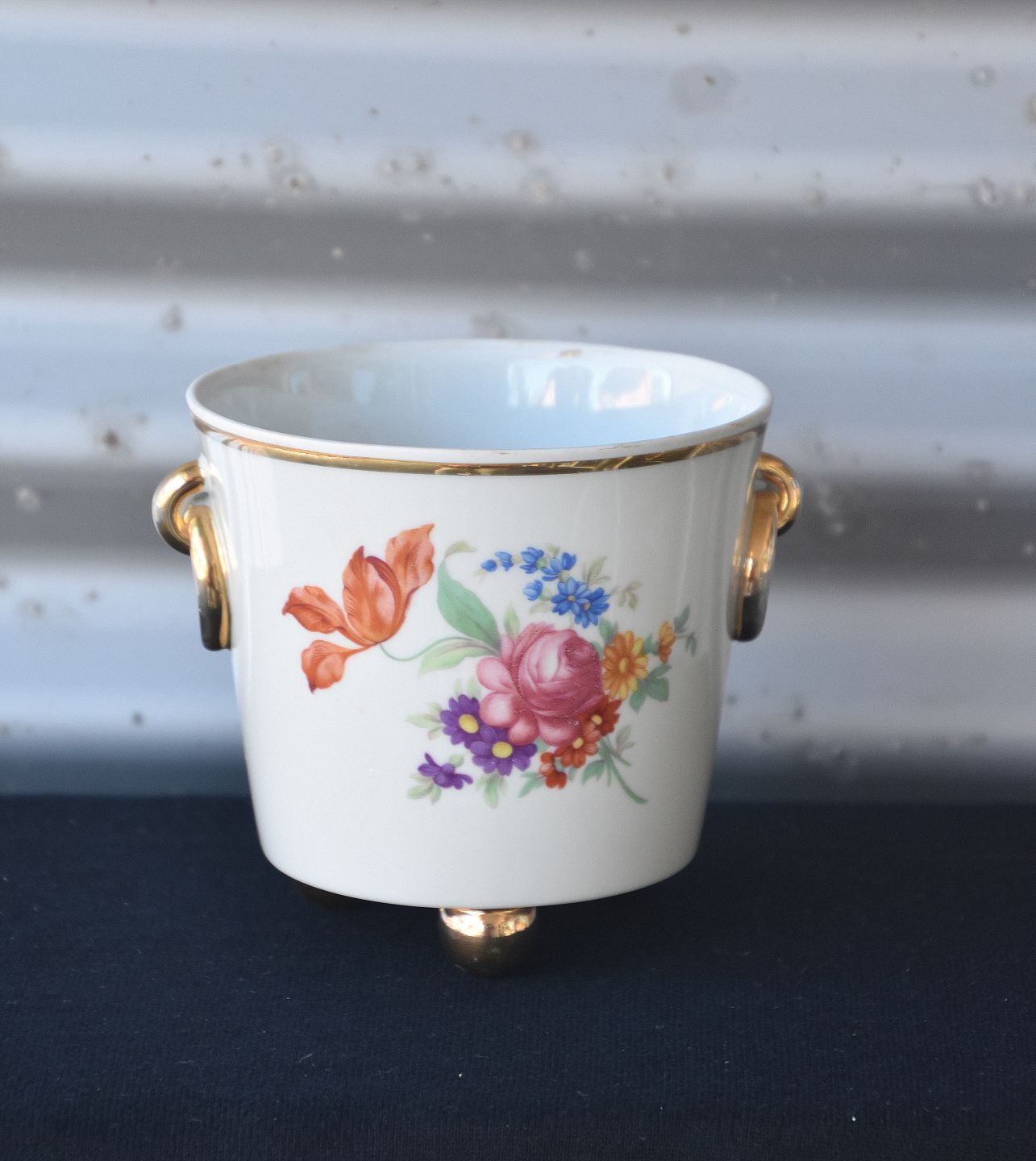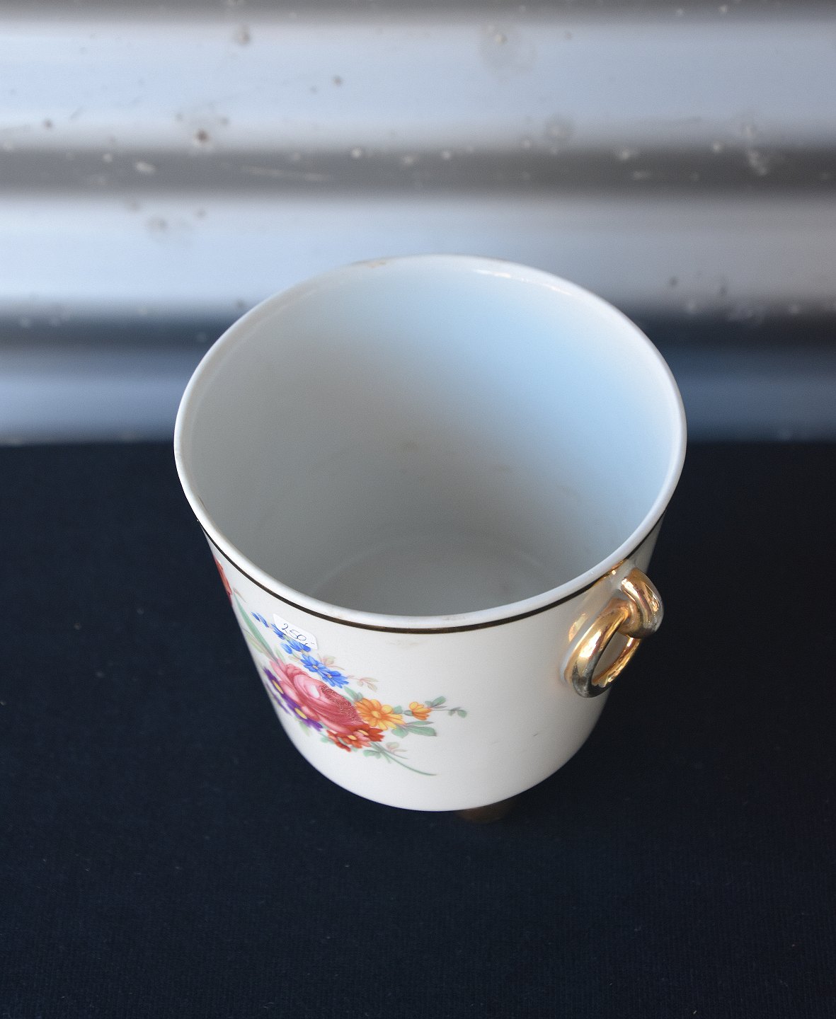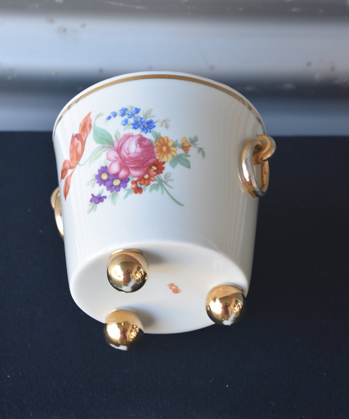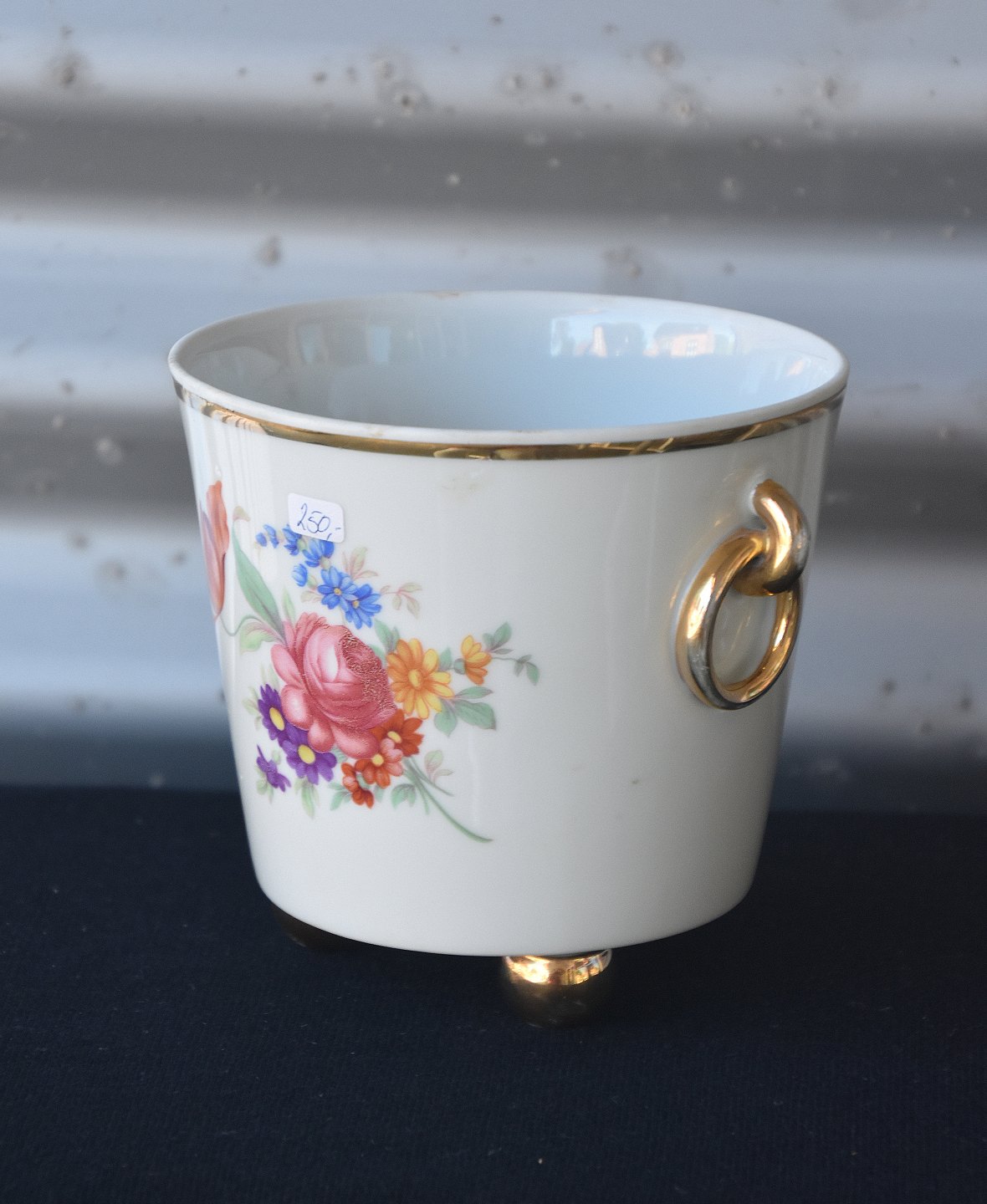 Urtepotte på guld kugle fødder. Urtepotteskjuleren er dekoreret med blomstermotiv i overførselsteknik, samt delvis forgyldningDesign Weissewasser, Made in Germany