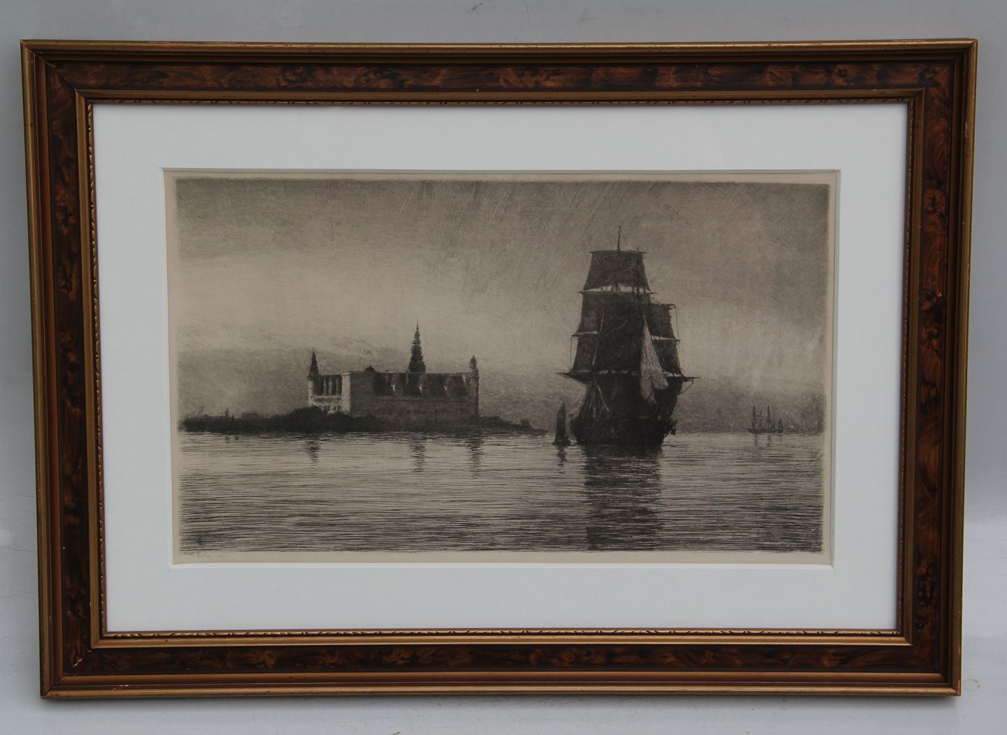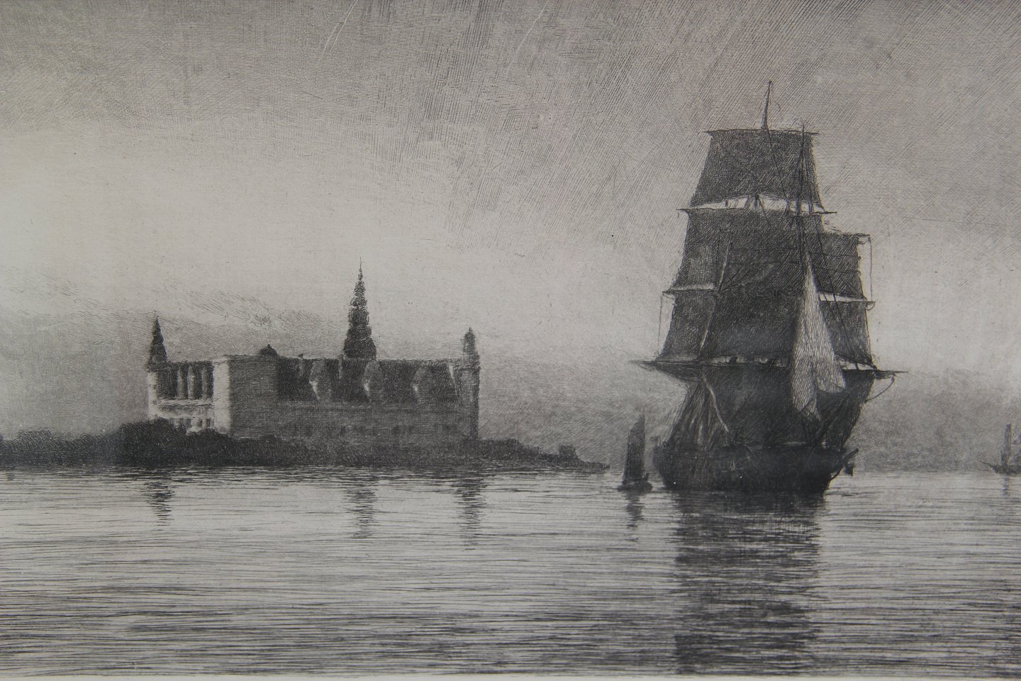 Carl Locher 1899 Skibe ved Kronborg 32 x 45 cm inklusiv ramme1851-1915 Carl Locher tilhørte gruppen af Skagensmalere