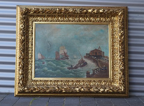 Molemiljø, med små og store skibe i vandet. Maleri, olie på lærredUkendt kunstner, midt 1800