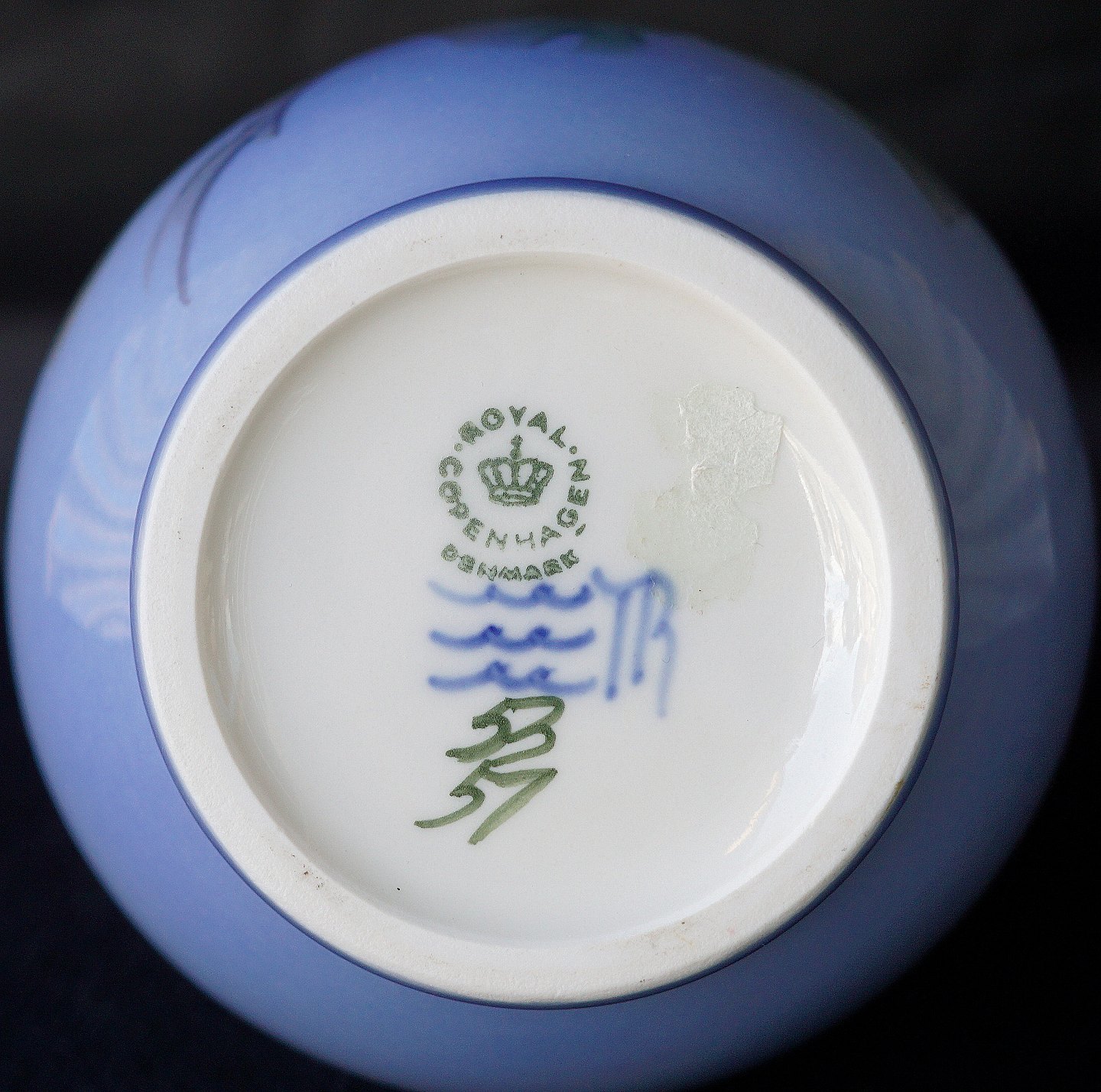 Royal Copenhagen, RC, Den Kongelige Porcelænsfabrik, KGL., blomster, hvide, grønne, blade, vase, pocelæn