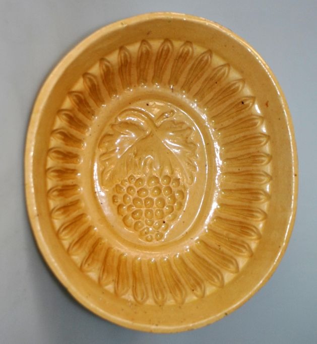 Bornholmsk buddinge form, 19. årh. Danmark. Gul glaseret. Oval. Indvendig med vin klase. L.: 26,5 cm. B.: 23 cm. H.: 12 cm.Perfekt stand!