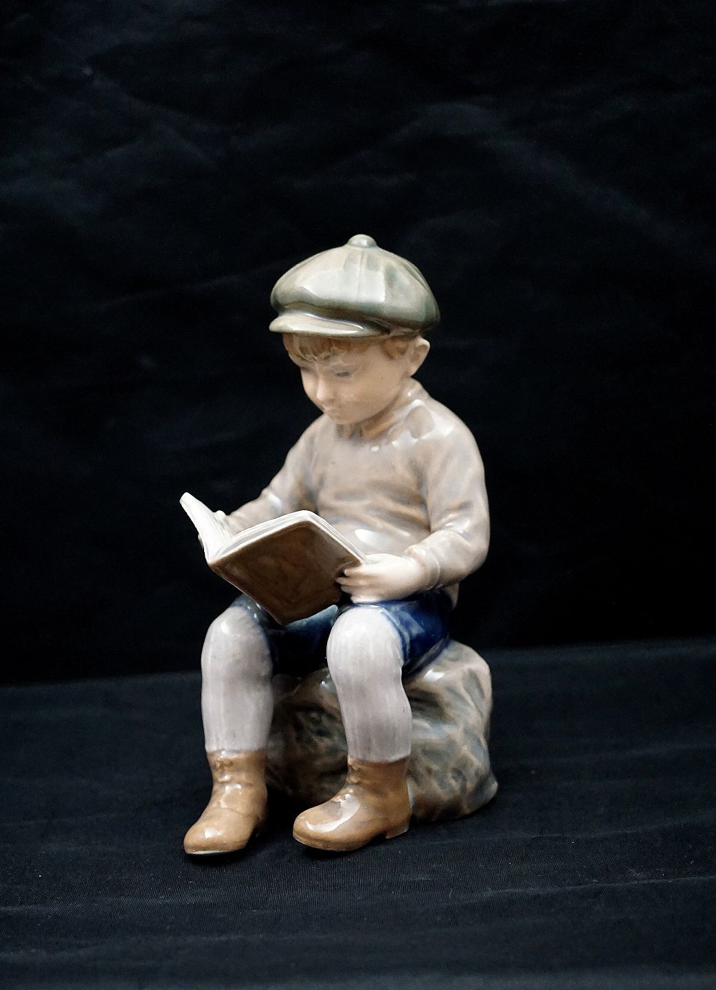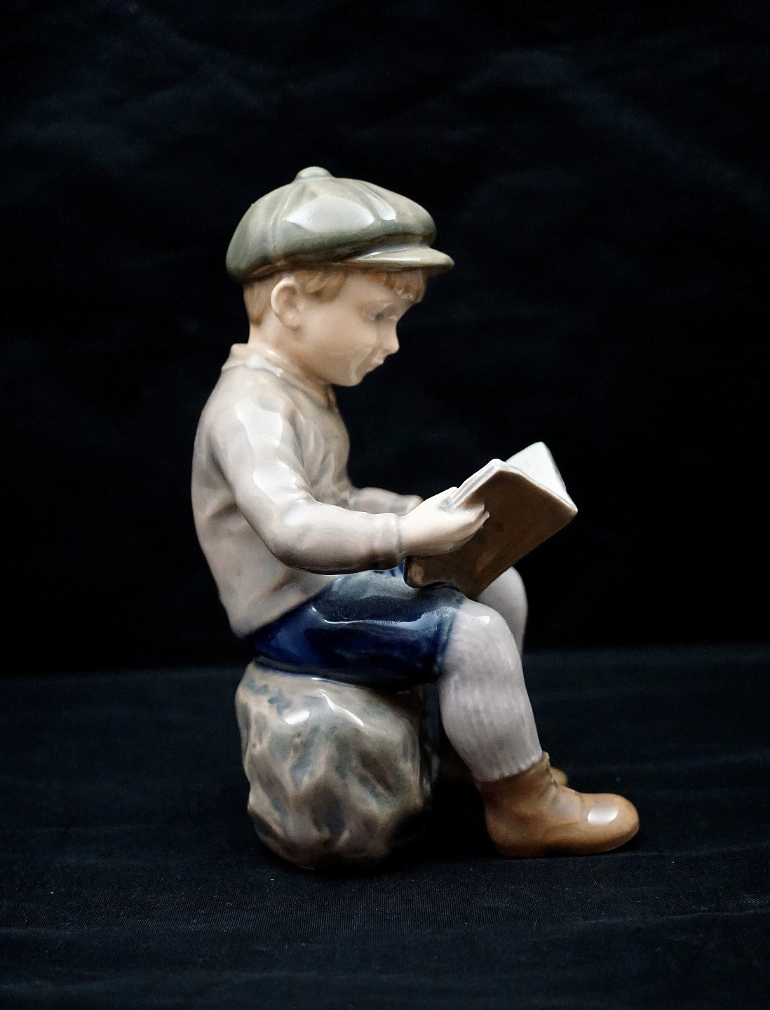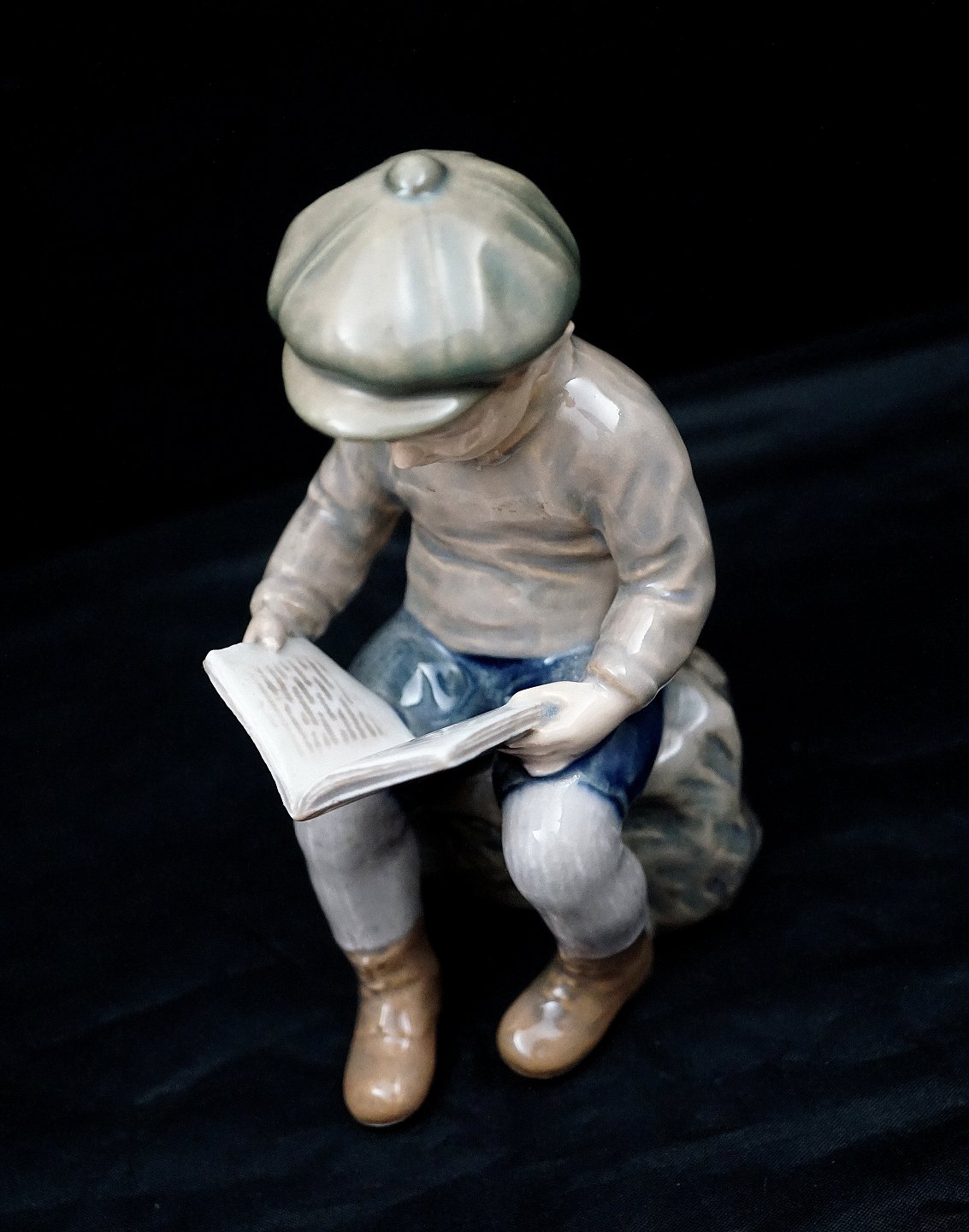 Dahl Jensen figur, Læsende Dreng, nr. 1096. Porcelænsfiguren er i 1. Sortering. Dreng med stor hat læser bog. Design: Jens Peter Dahl Jensen